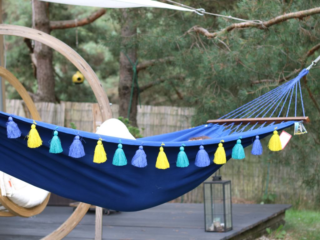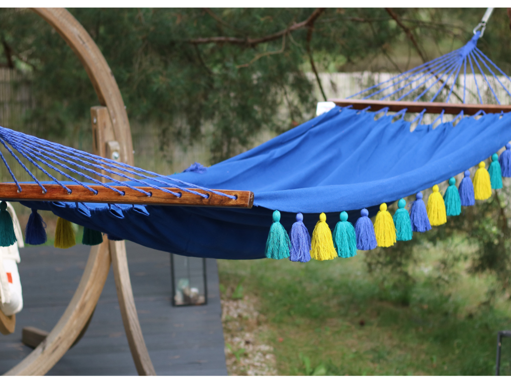 Le matériau du hamac est en coton tissé à la main de haute qualité avec des franges en forme de cloche sur les deux côtés du hamac qui lui confèrent un design unique et moderne. Le coton offre à la fois durabilité et respirabilité et n'irrite pas la peau, de sorte que le produit peut également être utilisé avec succès par les enfants.